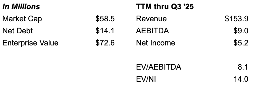 Heavy fabrication is where past profitability and future question marks appear, a dangerous combination. Post Q3, they did announce a $11M wind tower project that will be executed over Q1’26, giving good visibility through March 2026. The company line thus far has been that demand is there. However, their wind clients (e.g. GE) have not been told what size turbines they’re purchasing, so the demand has not resulted in hard backlog.