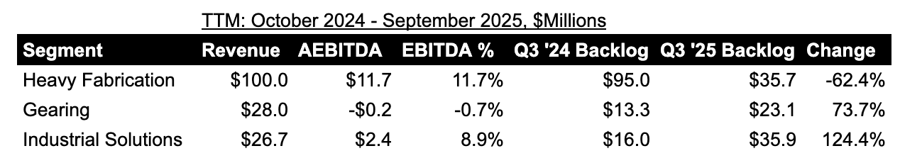 I feel really good about Gearing and Industrial Solutions, especially considering their natural gas exposure and recent backlog wins (more on this later). The big question heading into 2026 is what their heavy fabrications division is going to do. Right now, backlog is well off this point last year, even with a recent $11M tower order in early Q4.